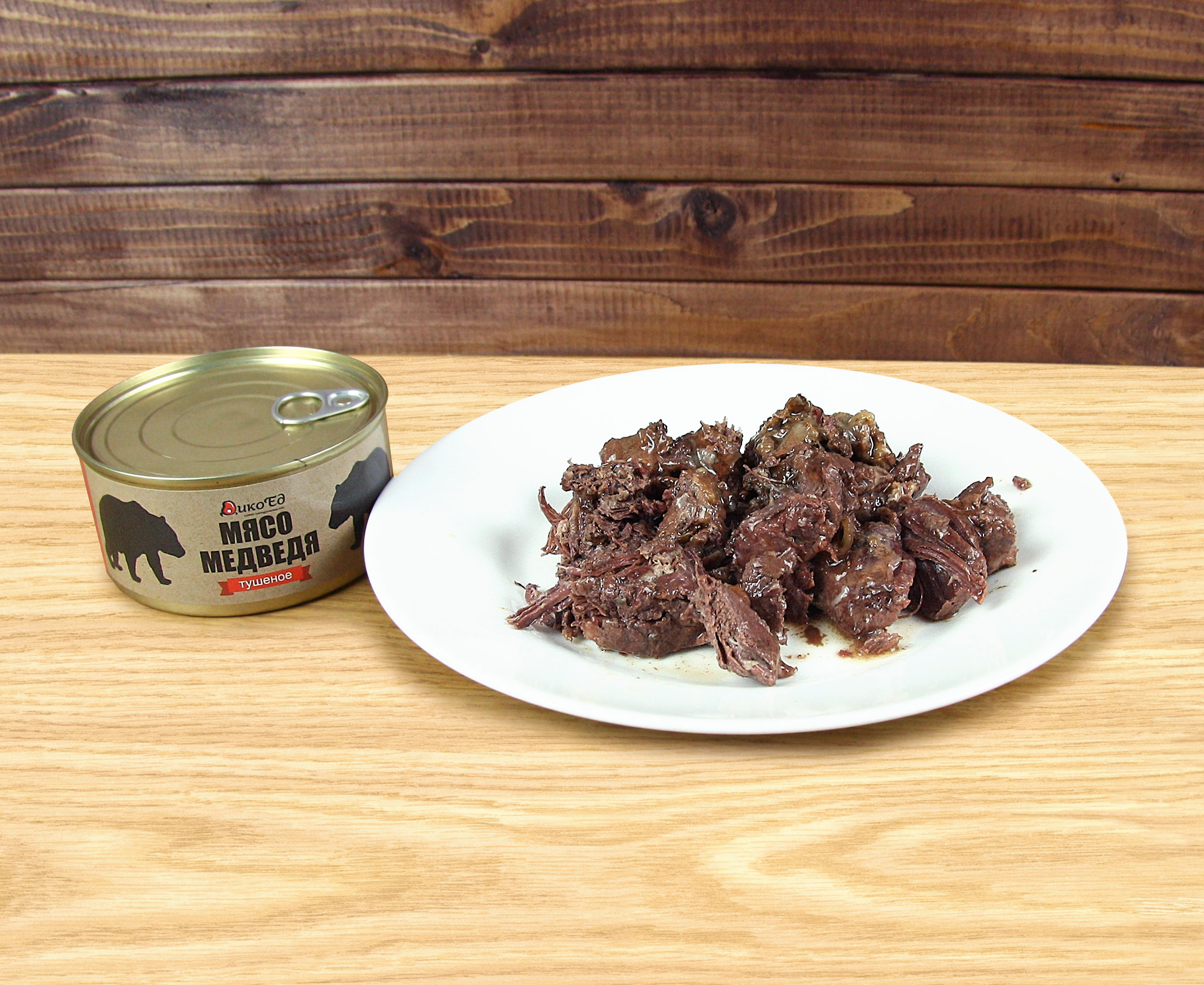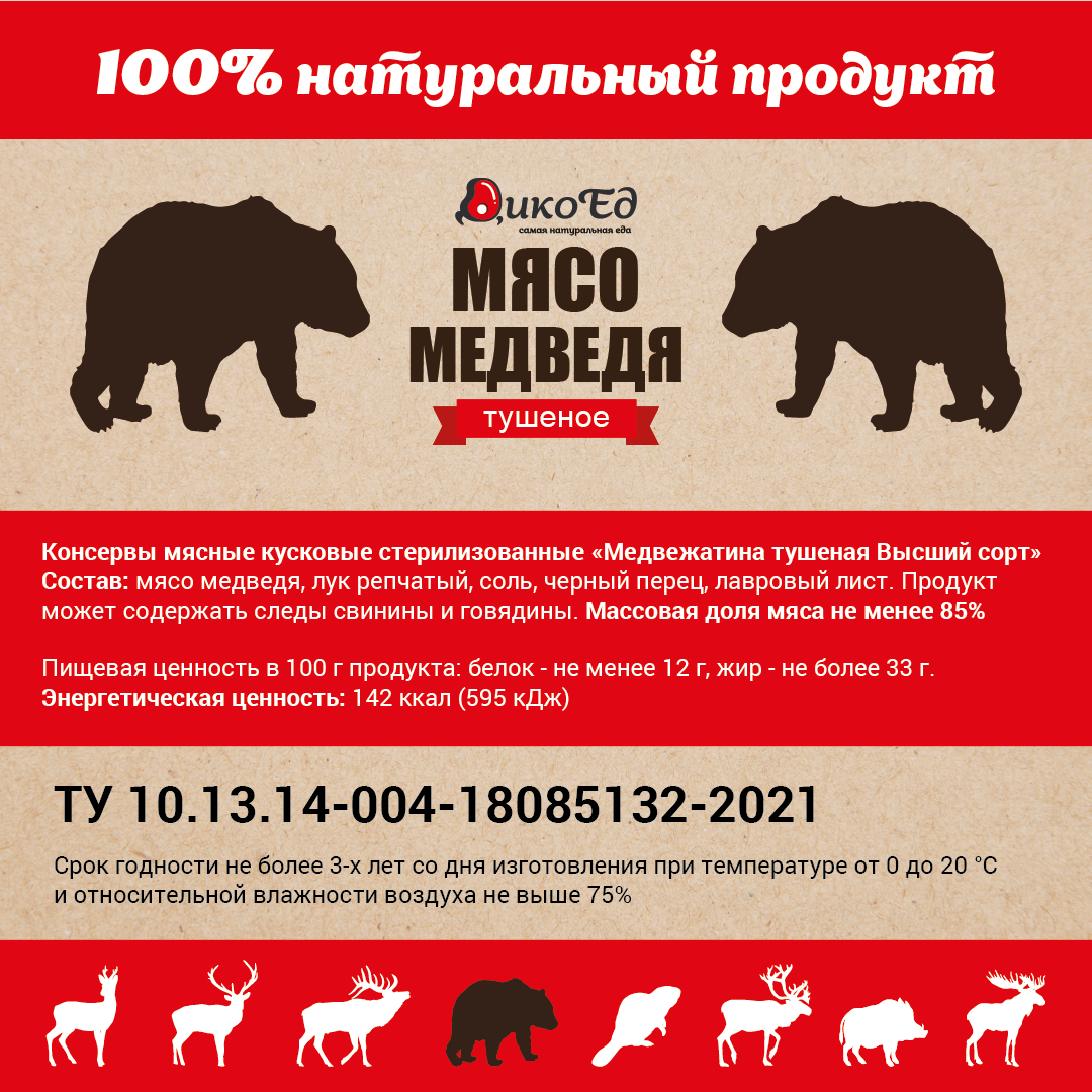 Приобрести тушеное мясо медведя в металлической банке вы можете для употребления как в холодном виде (например, со свежим хлебом), так и в разогретом (с картофелем, макаронами, крупами и овощами). Помимо медвежатины в состав продукта входит репчатый лук, соль, лавровый лист, черный и душистый перец. Такой деликатес отличается великолепным вкусом и полезными качествами. Ведь в медвежатине содержится необходимые организму минеральные вещества, витамины группы В, а также калий, селен, медь, цинк, натрий, фосфор и железо.
